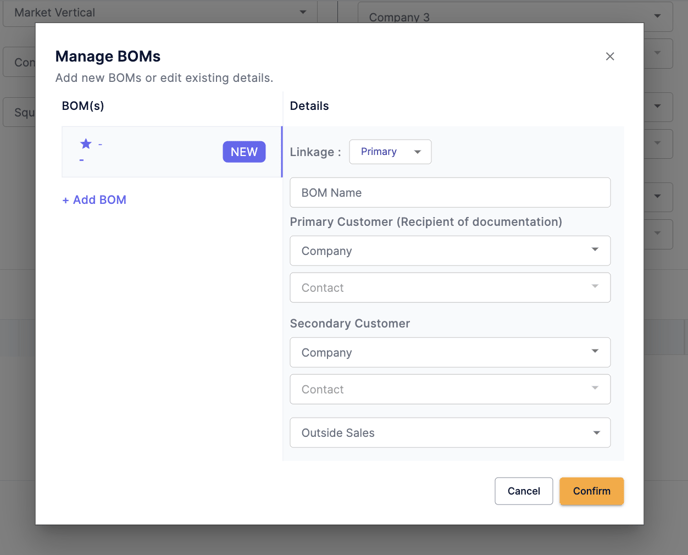 2. Enter in BOM information and customer as needed. Note: the first BOM would be considered the primary. Any other BOM created can be linked to the primary or unlinked. Linking it to the primary means it will be the exact same BOM besides customer information.