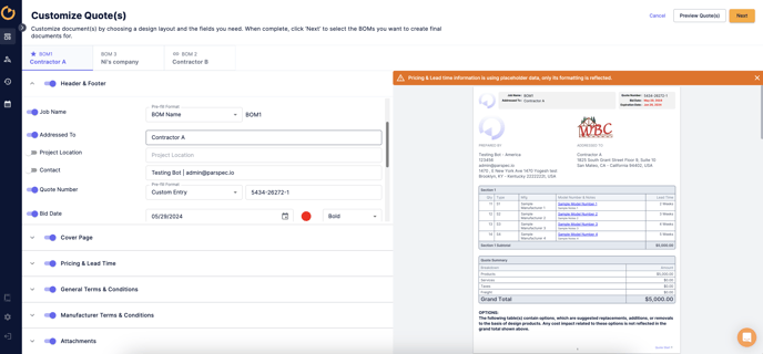 5. Customize the quotes within each BOM tab and select Next when ready to generate Note: the primary BOM fields toggled on or off will not automatically carry over to the linked BOMs.