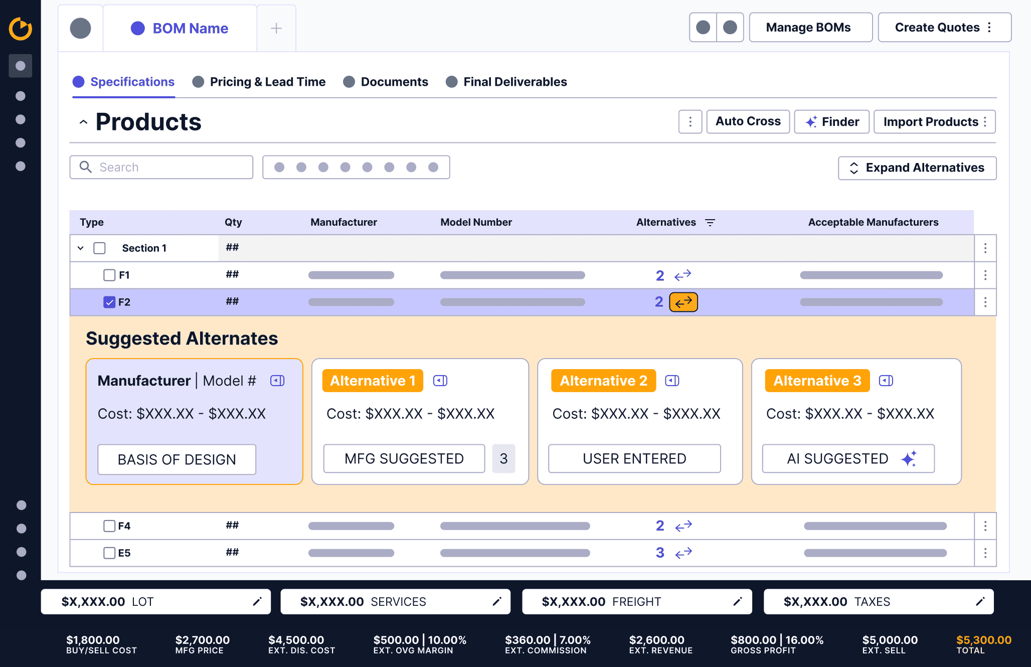 Quickly cross multiple line items with user-defined or AI-recommended alternatives, backed by product data and historical context to win more bids and capture more of each project.